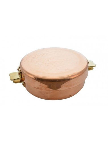 Plat à sauter à poignées, cuivre de 2mm d'épaisseur, intérieur acier inoxydable, monture bronze, vendu avec couvercle. Les avantages du cuivre sans les contraintes d’entretien et de nettoyage, grâce à la feuille d’inox.